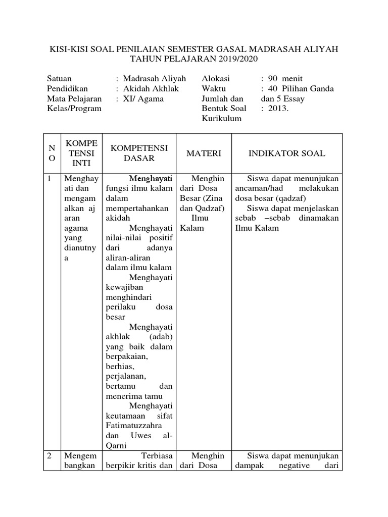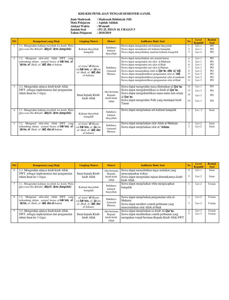 29 okt 2019 kisi kisi soal uas akidah akhlak kelas viii semester butir soal 45 soal bentuk soal pg 40 essay 5 n o 1 kompetensi inti 1.